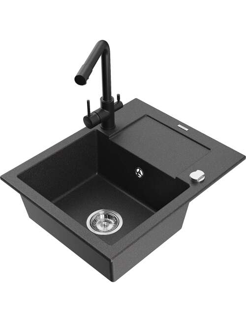 Dane techniczne: Zlewozmywak: Rozmiar: 576x465x174 mm Głębokość komory: 164 mm Wymiary komory: 395x320 mm Średnica odpływu: ø90 mm Typ: 1-komorowy z krótkim ociekaczem Rodzaj: Wpuszczany w blat Kolor: Czarny nakrapiany Wykończenie syfonu: Chrom Materiał: Granit (80% kruszywo granitowe 20% żywice) Otwór przelewowy: Tak Otwory: ( bateria, automat ) 2 Montaż: Uniwersalny, możliwość montażu z ociekaczem po lewej lub prawej stronie Wysoka odporność na zarysowania i przebarwienia Odporność na szok termiczny Powierzchnia ułatwiająca czyszczenie Dwa dodatkowe podfrezowane otwory do samodzielnego wybicia ø35 Bateria kuchenna: Materiał: Mosiądz Kolor: Czarny Głowica: Ceramiczna Perlator: Tak Typ: Dwuuchwytowa Zasięg wylewki: 235 mm Wysokość baterii: 315 mm Bateria dwugłowicowa z dodatkowym filtrem do wody pitnej |