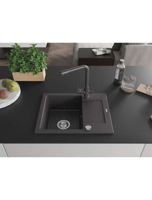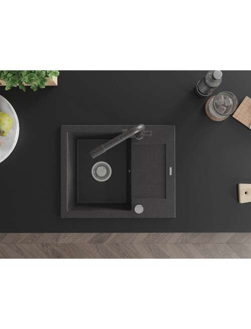 Mexen Enzo zlewozmywak granitowy 1-komorowy z ociekaczem i baterią kuchenną Duero, czarny nakrapiany - 6506-76-671600-76