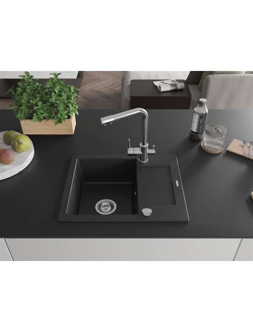 Mexen Enzo zlewozmywak granitowy 1-komorowy z ociekaczem i baterią kuchenną Duero, czarny/srebrny metalik - 6506-73-671600-00