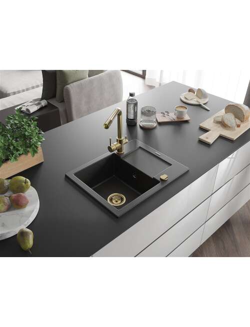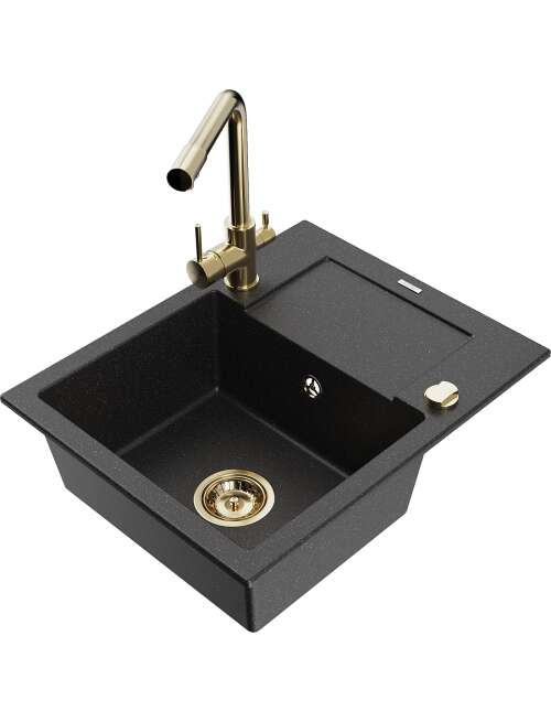 Dane techniczne: Zlewozmywak: Rozmiar: 576x465x174 mm Głębokość komory: 164 mm Wymiary komory: 395x320 mm Średnica odpływu: ø90 mm Typ: 1-komorowy z krótkim ociekaczem Rodzaj: Wpuszczany w blat Kolor: Czarny/Srebrny metalik Wykończenie syfonu: Złoty Materiał: Granit (80% kruszywo granitowe 20% żywice) Otwór przelewowy: Tak Otwory: ( bateria, automat ) 2 Montaż: Uniwersalny, możliwość montażu z ociekaczem po lewej lub prawej stronie Wysoka odporność na zarysowania i przebarwienia Odporność na szok termiczny Powierzchnia ułatwiająca czyszczenie Dwa dodatkowe podfrezowane otwory do samodzielnego wybicia ø35 Bateria kuchenna: Materiał: Mosiądz Kolor: Złoty Głowica: Ceramiczna Perlator: Tak Typ: Dwuuchwytowa Zasięg wylewki: 235 mm Wysokość baterii: 315 mm Bateria dwugłowicowa z dodatkowym filtrem do wody pitnej |
