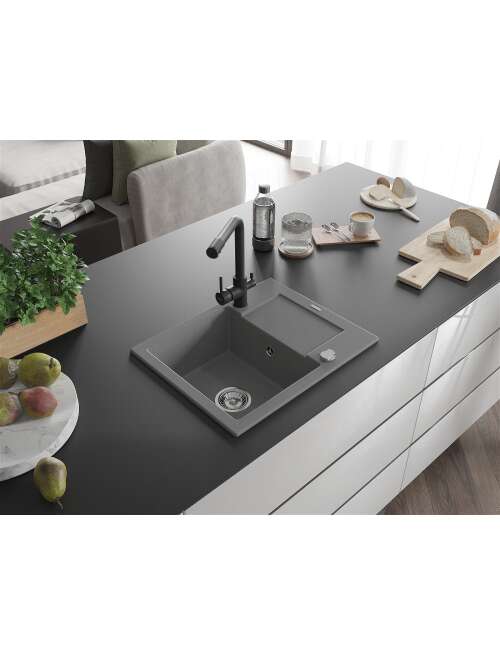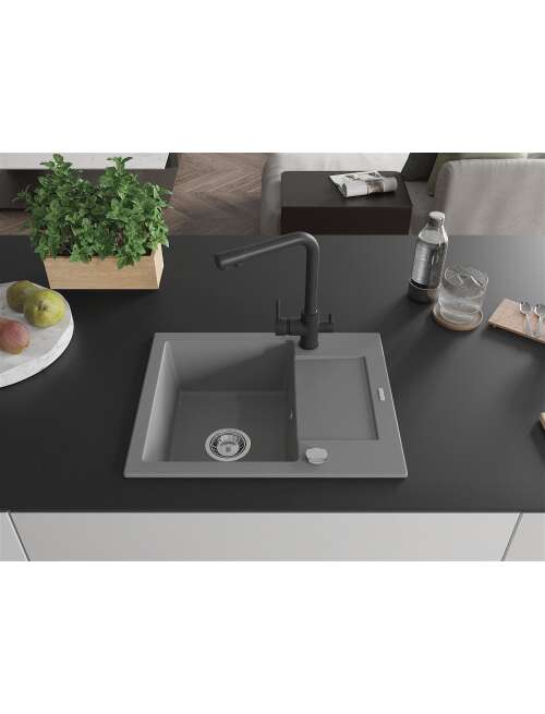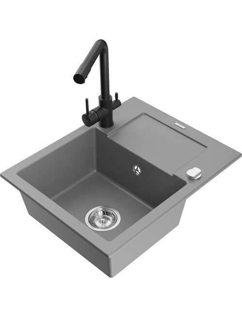 Dane techniczne: Zlewozmywak: Rozmiar: 576x465x174 mm Głębokość komory: 164 mm Wymiary komory: 395x320 mm Średnica odpływu: ø90 mm Typ: 1-komorowy z krótkim ociekaczem Rodzaj: Wpuszczany w blat Kolor: Szary Wykończenie syfonu: Chrom Materiał: Granit (80% kruszywo granitowe 20% żywice) Otwór przelewowy: Tak Otwory: ( bateria, automat ) 2 Montaż: Uniwersalny, możliwość montażu z ociekaczem po lewej lub prawej stronie Wysoka odporność na zarysowania i przebarwienia Odporność na szok termiczny Powierzchnia ułatwiająca czyszczenie Dwa dodatkowe podfrezowane otwory do samodzielnego wybicia ø35 Bateria kuchenna: Materiał: Mosiądz Kolor: Czarny Głowica: Ceramiczna Perlator: Tak Typ: Dwuuchwytowa Zasięg wylewki: 235 mm Wysokość baterii: 315 mm Bateria dwugłowicowa z dodatkowym filtrem do wody pitnej |