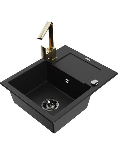 Mexen Enzo zlewozmywak granitowy 1-komorowy z ociekaczem i baterią kuchenną Rita, czarny - 6506-77-670300-50-B