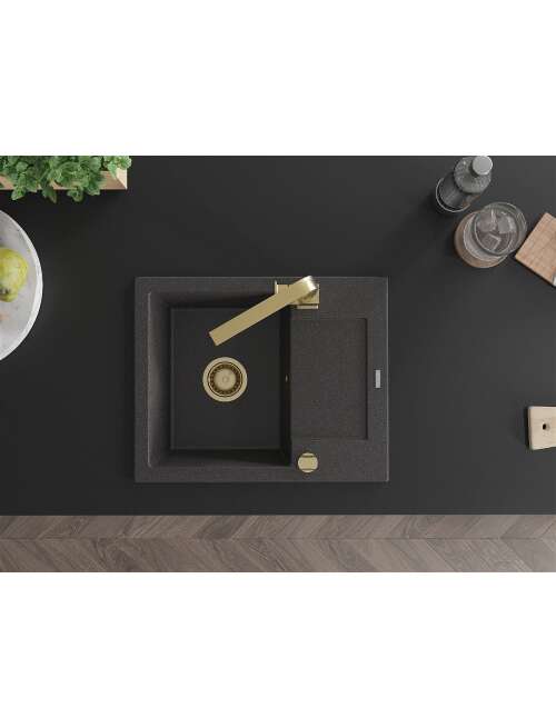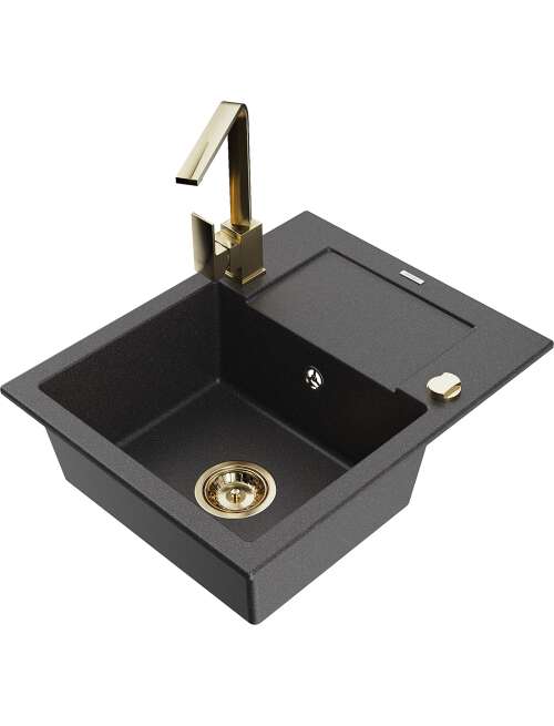 Dane techniczne: Zlewozmywak: Rozmiar: 576x465x174 mm Głębokość komory: 164 mm Wymiary komory: 395x320 mm Średnica odpływu: ø90 mm Typ: 1-komorowy z krótkim ociekaczem Rodzaj: Wpuszczany w blat Kolor: Czarny nakrapiany Wykończenie syfonu: Złoty Materiał: Granit (80% kruszywo granitowe 20% żywice) Otwór przelewowy: Tak Otwory: ( bateria, automat ) 2 Montaż: Uniwersalny, możliwość montażu z ociekaczem po lewej lub prawej stronie Wysoka odporność na zarysowania i przebarwienia Odporność na szok termiczny Powierzchnia ułatwiająca czyszczenie Dwa dodatkowe podfrezowane otwory do samodzielnego wybicia ø35 Bateria kuchenna: Materiał: Mosiądz Kolor: Złoty Głowica: Ceramiczna Perlator: Tak Typ: Jednouchwytowa Wysokość baterii: 290 mm Zasięg wylewki: 220 mm |