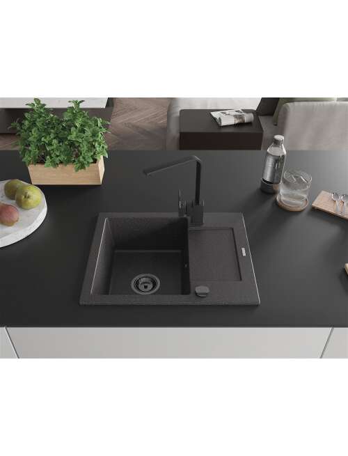 Dane techniczne: Zlewozmywak: Rozmiar: 576x465x174 mm Głębokość komory: 164 mm Wymiary komory: 395x320 mm Średnica odpływu: ø90 mm Typ: 1-komorowy z krótkim ociekaczem Rodzaj: Wpuszczany w blat Kolor: Czarny nakrapiany Wykończenie syfonu: Czarny Materiał: Granit (80% kruszywo granitowe 20% żywice) Otwór przelewowy: Tak Otwory: ( bateria, automat ) 2 Montaż: Uniwersalny, możliwość montażu z ociekaczem po lewej lub prawej stronie Wysoka odporność na zarysowania i przebarwienia Odporność na szok termiczny Powierzchnia ułatwiająca czyszczenie Dwa dodatkowe podfrezowane otwory do samodzielnego wybicia ø35 Bateria kuchenna: Materiał: Mosiądz Kolor: Czarny Głowica: Ceramiczna Perlator: Tak Typ: Jednouchwytowa Wysokość baterii: 290 mm Zasięg wylewki: 220 mm |
