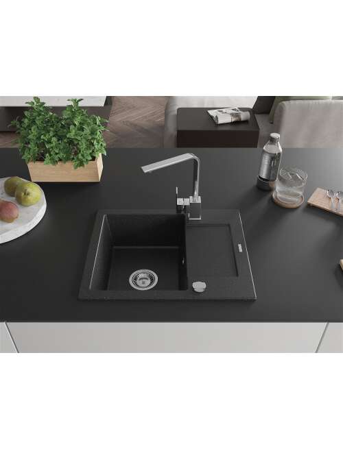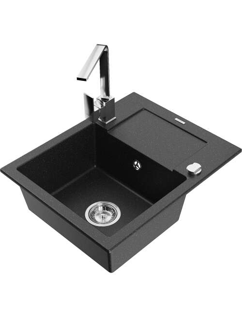Dane techniczne: Zlewozmywak: Rozmiar: 576x465x174 mm Głębokość komory: 164 mm Wymiary komory: 395x320 mm Średnica odpływu: ø90 mm Typ: 1-komorowy z krótkim ociekaczem Rodzaj: Wpuszczany w blat Kolor: Czarny/Srebrny metalik Wykończenie syfonu: Chrom Materiał: Granit (80% kruszywo granitowe 20% żywice) Otwór przelewowy: Tak Otwory: ( bateria, automat ) 2 Montaż: Uniwersalny, możliwość montażu z ociekaczem po lewej lub prawej stronie Wysoka odporność na zarysowania i przebarwienia Odporność na szok termiczny Powierzchnia ułatwiająca czyszczenie Dwa dodatkowe podfrezowane otwory do samodzielnego wybicia ø35 Bateria kuchenna: Materiał: Mosiądz Kolor: Chrom Głowica: Ceramiczna Perlator: Tak Typ: Jednouchwytowa Wysokość baterii: 290 mm Zasięg wylewki: 220 mm |