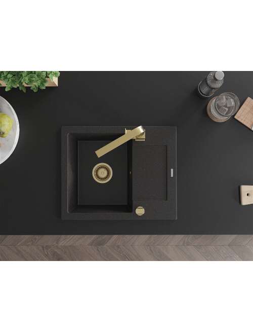 Mexen Enzo zlewozmywak granitowy 1-komorowy z ociekaczem i baterią kuchenną Rita, czarny/srebrny metalik - 6506-73-670300-50