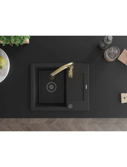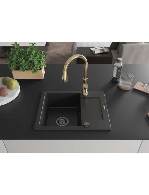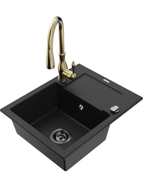 Dane techniczne: Zlewozmywak: Rozmiar: 576x465x174 mm Głębokość komory: 164 mm Wymiary komory: 395x320 mm Średnica odpływu: ø90 mm Typ: 1-komorowy z krótkim ociekaczem Rodzaj: Wpuszczany w blat Kolor: Czarny Wykończenie syfonu: Czarny Materiał: Granit (80% kruszywo granitowe 20% żywice) Otwór przelewowy: Tak Otwory: ( bateria, automat ) 2 Montaż: Uniwersalny, możliwość montażu z ociekaczem po lewej lub prawej stronie Wysoka odporność na zarysowania i przebarwienia Odporność na szok termiczny Powierzchnia ułatwiająca czyszczenie Dwa dodatkowe podfrezowane otwory do samodzielnego wybicia ø35 Bateria kuchenna: Materiał: Mosiądz Kolor: Złoty Głowica: Ceramiczna Perlator: Tak Typ: Jednouchwytowa Wysokość baterii: 410 mm Zasięg wylewki: 231 mm |