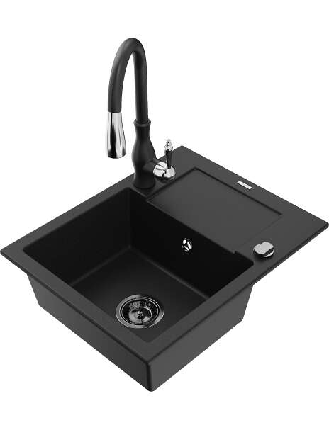Dane techniczne: Zlewozmywak: Rozmiar: 576x465x174 mm Głębokość komory: 164 mm Wymiary komory: 395x320 mm Średnica odpływu: ø90 mm Typ: 1-komorowy z krótkim ociekaczem Rodzaj: Wpuszczany w blat Kolor: Czarny Wykończenie syfonu: Czarny Materiał: Granit (80% kruszywo granitowe 20% żywice) Otwór przelewowy: Tak Otwory: ( bateria, automat ) 2 Montaż: Uniwersalny, możliwość montażu z ociekaczem po lewej lub prawej stronie Wysoka odporność na zarysowania i przebarwienia Odporność na szok termiczny Powierzchnia ułatwiająca czyszczenie Dwa dodatkowe podfrezowane otwory do samodzielnego wybicia ø35 Bateria kuchenna: Materiał: Mosiądz Kolor: Czarny Głowica: Ceramiczna Perlator: Tak Typ: Jednouchwytowa Wysokość baterii: 410 mm Zasięg wylewki: 231 mm |