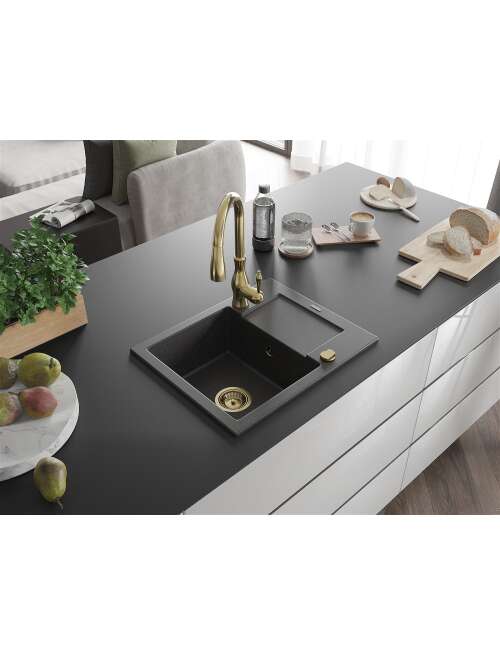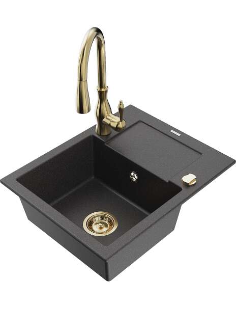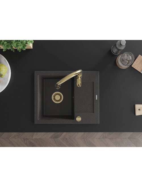 Dane techniczne: Zlewozmywak: Rozmiar: 576x465x174 mm Głębokość komory: 164 mm Wymiary komory: 395x320 mm Średnica odpływu: ø90 mm Typ: 1-komorowy z krótkim ociekaczem Rodzaj: Wpuszczany w blat Kolor: Czarny nakrapiany Wykończenie syfonu: Złoty Materiał: Granit (80% kruszywo granitowe 20% żywice) Otwór przelewowy: Tak Otwory: ( bateria, automat ) 2 Montaż: Uniwersalny, możliwość montażu z ociekaczem po lewej lub prawej stronie Wysoka odporność na zarysowania i przebarwienia Odporność na szok termiczny Powierzchnia ułatwiająca czyszczenie Dwa dodatkowe podfrezowane otwory do samodzielnego wybicia ø35 Bateria kuchenna: Materiał: Mosiądz Kolor: Złoty Głowica: Ceramiczna Perlator: Tak Typ: Jednouchwytowa Wysokość baterii: 410 mm Zasięg wylewki: 231 mm |
