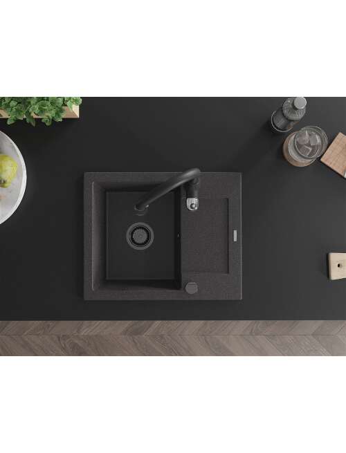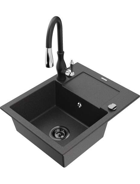Mexen Enzo zlewozmywak granitowy 1-komorowy z ociekaczem i baterią kuchenną Savita, czarny nakrapiany - 6506-76-672601-70-B