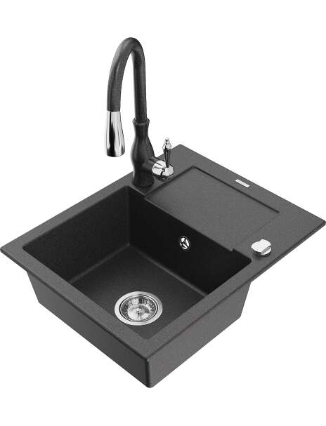 Mexen Enzo zlewozmywak granitowy 1-komorowy z ociekaczem i baterią kuchenną Savita, czarny nakrapiany - 6506-76-672601-76