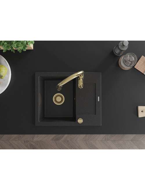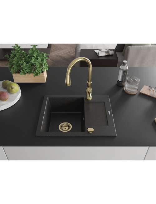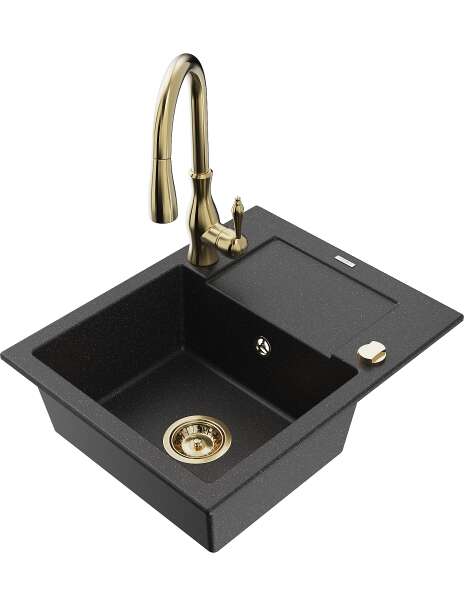 Dane techniczne: Zlewozmywak: Rozmiar: 576x465x174 mm Głębokość komory: 164 mm Wymiary komory: 395x320 mm Średnica odpływu: ø90 mm Typ: 1-komorowy z krótkim ociekaczem Rodzaj: Wpuszczany w blat Kolor: Czarny/Srebrny metalik Wykończenie syfonu: Złoty Materiał: Granit (80% kruszywo granitowe 20% żywice) Otwór przelewowy: Tak Otwory: ( bateria, automat ) 2 Montaż: Uniwersalny, możliwość montażu z ociekaczem po lewej lub prawej stronie Wysoka odporność na zarysowania i przebarwienia Odporność na szok termiczny Powierzchnia ułatwiająca czyszczenie Dwa dodatkowe podfrezowane otwory do samodzielnego wybicia ø35 Bateria kuchenna: Materiał: Mosiądz Kolor: Złoty Głowica: Ceramiczna Perlator: Tak Typ: Jednouchwytowa Wysokość baterii: 410 mm Zasięg wylewki: 231 mm |