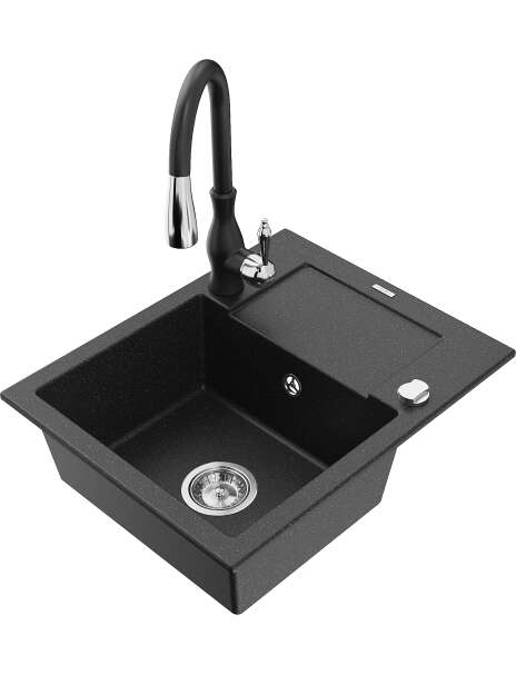 Mexen Enzo zlewozmywak granitowy 1-komorowy z ociekaczem i baterią kuchenną Savita, czarny/srebrny metalik - 6506-73-672601-70