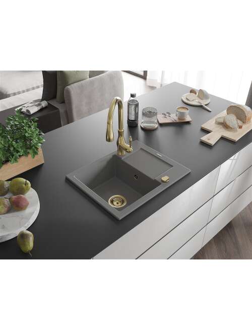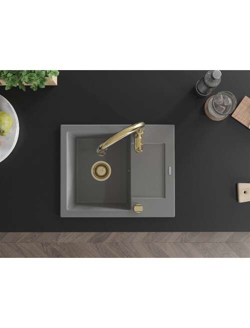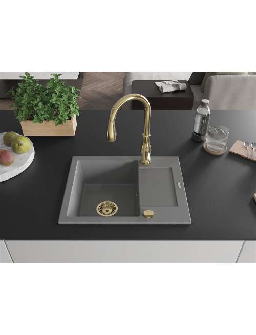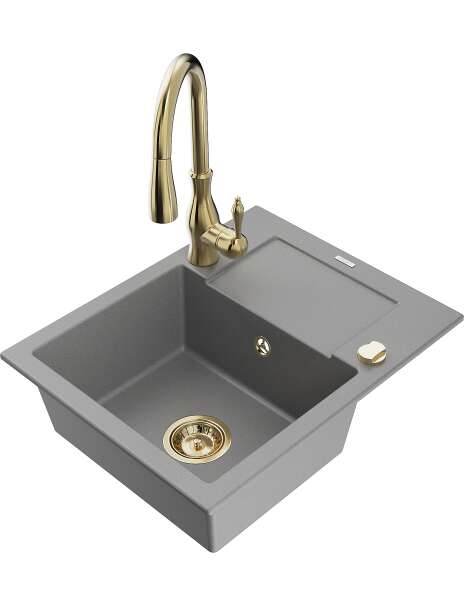 Mexen Enzo zlewozmywak granitowy 1-komorowy z ociekaczem i baterią kuchenną Savita, szary - 6506-71-672601-50