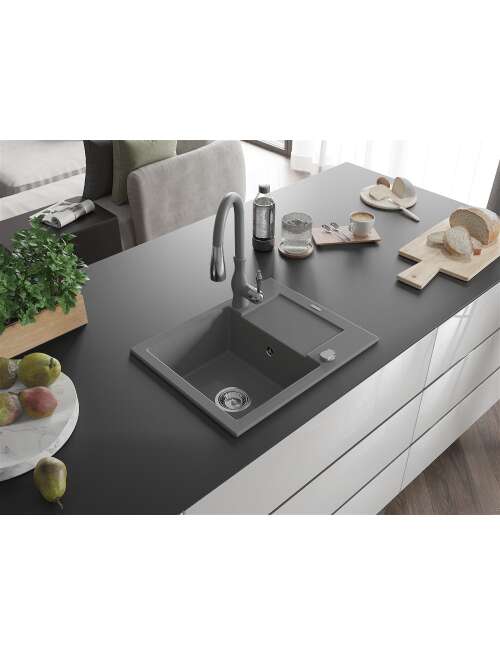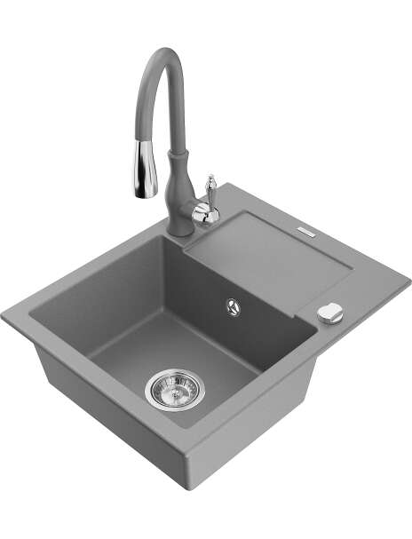 Mexen Enzo zlewozmywak granitowy 1-komorowy z ociekaczem i baterią kuchenną Savita, szary - 6506-71-672601-71