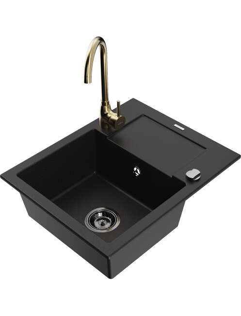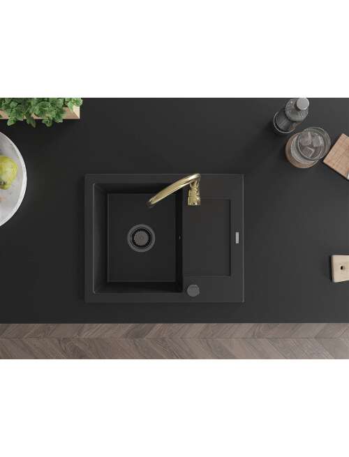 Mexen Enzo zlewozmywak granitowy 1-komorowy z ociekaczem i baterią kuchenną Telma, czarny - 6506-77-670200-50-B