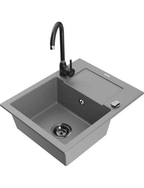 Mexen Enzo zlewozmywak granitowy 1-komorowy z ociekaczem i baterią kuchenną Telma, szary - 6506-71-670200-70-B