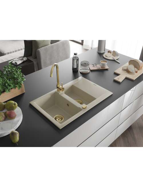 Dane techniczne: Rozmiar: 737x475x177 mm Głębokość komory: 167 mm (większa), 107 mm (mniejsza) Wymiary komory: 395x272 mm (większa), 375x182 mm (mniejsza) Średnica odpływu: ø90 mm Rodzaj: 1,5-komorowy z krótkim ociekaczem Typ: Wpuszczany w blat Materiał: Granit Kolor: Beżowy Wykończenie syfonu: Złoty Otwór przelewowy: Tak Otwór na baterie: Tak Syfon automatyczny w komplecie Wysoka odporność na zarysowania i przebarwienia Odporność na szok termiczny Powierzchnia ułatwiająca czyszczenie |