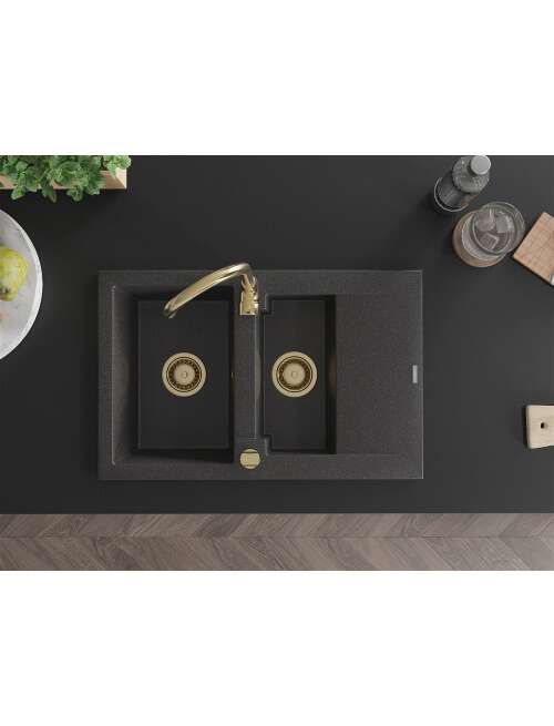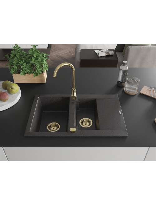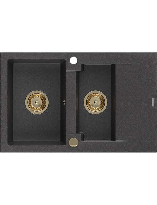 Mexen Gaspar zlewozmywak granitowy 1,5-komorowy z ociekaczem 737 x 475 mm, czarny nakrapiany, syfon złoty - 6507731505-76-G