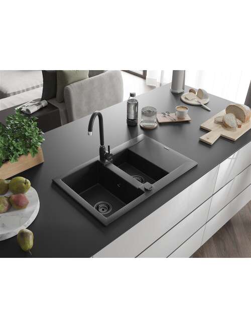 Mexen Gaspar zlewozmywak granitowy 1,5-komorowy z ociekaczem 737 x 475 mm czarny/srebrny metalik, syfon czarny - 6507731505-73-B