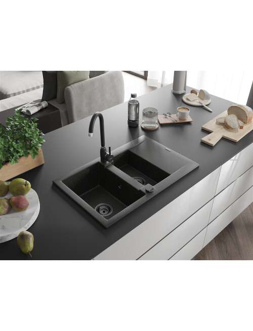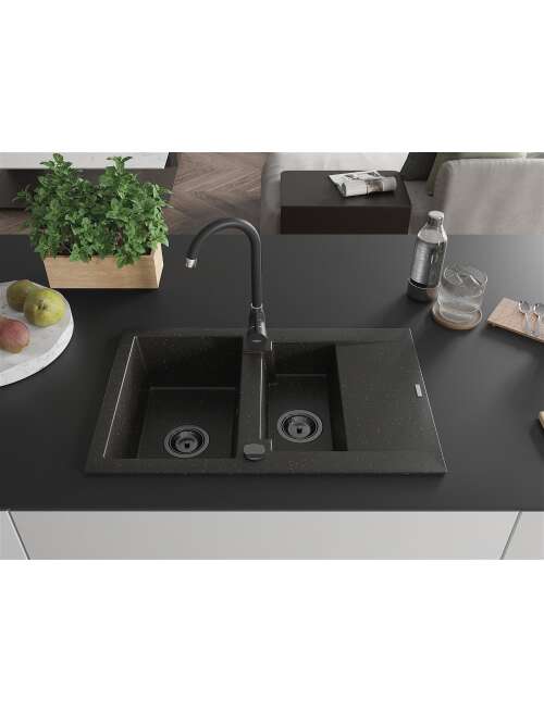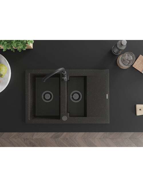 Dane techniczne: Rozmiar: 737x475x177 mm Głębokość komory: 167 mm (większa), 107 mm (mniejsza) Wymiary komory: 395x272 mm (większa), 375x182 mm (mniejsza) Średnica odpływu: ø90 mm Rodzaj: 1,5-komorowy z krótkim ociekaczem Typ: Wpuszczany w blat Materiał: Granit Kolor: Czarny/Złoty metalik Wykończenie syfonu: Czarny Otwór przelewowy: Tak Otwór na baterie: Tak Syfon automatyczny w komplecie Wysoka odporność na zarysowania i przebarwienia Odporność na szok termiczny Powierzchnia ułatwiająca czyszczenie |