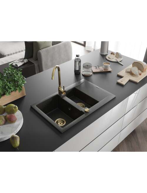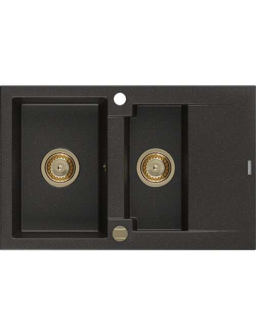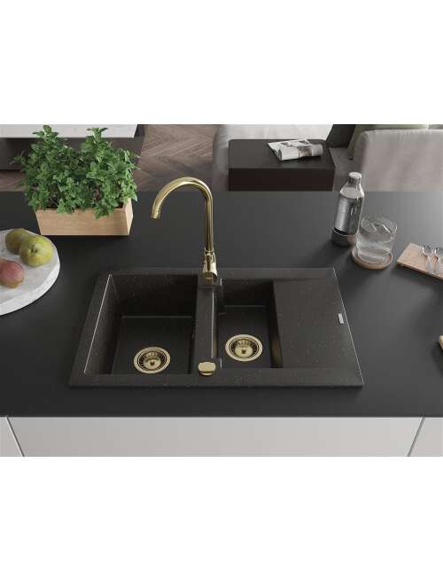 Mexen Gaspar zlewozmywak granitowy 1,5-komorowy z ociekaczem 737 x 475 mm, czarny/złoty metalik, syfon złoty - 6507731505-75-G