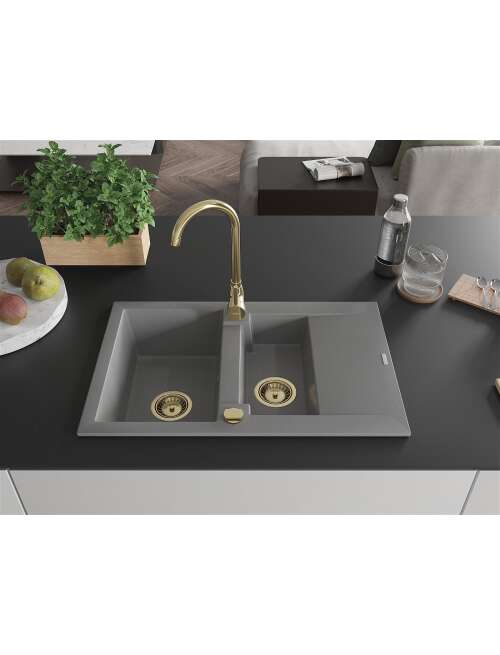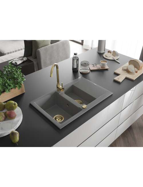 Dane techniczne: Rozmiar: 737x475x177 mm Głębokość komory: 167 mm (większa), 107 mm (mniejsza) Wymiary komory: 395x272 mm (większa), 375x182 mm (mniejsza) Średnica odpływu: ø90 mm Rodzaj: 1,5-komorowy z krótkim ociekaczem Typ: Wpuszczany w blat Materiał: Granit Kolor: Szary Wykończenie syfonu: Złoty Otwór przelewowy: Tak Otwór na baterie: Tak Syfon automatyczny w komplecie Wysoka odporność na zarysowania i przebarwienia Odporność na szok termiczny Powierzchnia ułatwiająca czyszczenie |