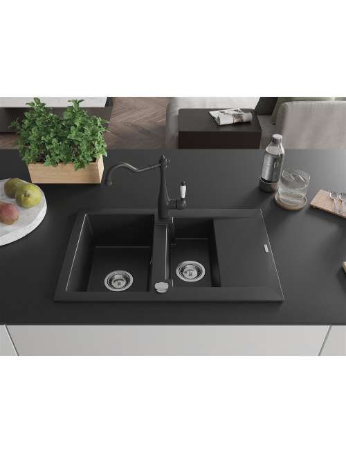 Dane techniczne: Zlewozmywak: Rozmiar: 737x475x177 mm Głębokość komory: 167 mm (większa), 107 mm (mniejsza) Wymiary komory: 395x272 mm (większa), (mniejsza) 375x182 mm Średnica odpływu: ø90 mm Typ: 1,5-komorowy z krótkim ociekaczem Rodzaj: Wpuszczany w blat Kolor: Czarny Wykończenie syfonu: Chrom Materiał: Granit (80% kruszywo granitowe 20% żywice) Otwór przelewowy: Tak Otwory: ( bateria, automat ) 2 Montaż: Uniwersalny, możliwość montażu z ociekaczem po lewej lub prawej stronie Wysoka odporność na zarysowania i przebarwienia Odporność na szok termiczny Powierzchnia ułatwiająca czyszczenie Bateria kuchenna: Materiał: Mosiądz Kolor: Chrom Głowica: Ceramiczna Perlator: Tak Typ: Jednouchwytowa Wysokość baterii: 290 mm Zasięg wylewki: 260 mm |