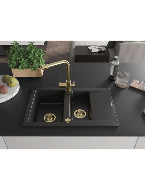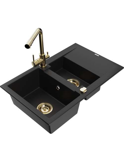 Dane techniczne: Zlewozmywak: Rozmiar: 737x475x177 mm Głębokość komory: 167 mm (większa), 107 mm (mniejsza) Wymiary komory: 395x272 mm (większa), (mniejsza) 375x182 mm Średnica odpływu: ø90 mm Typ: 1,5-komorowy z krótkim ociekaczem Rodzaj: Wpuszczany w blat Kolor: Czarny Wykończenie syfonu: Złoty Materiał: Granit (80% kruszywo granitowe 20% żywice) Otwór przelewowy: Tak Otwory: ( bateria, automat ) 2 Montaż: Uniwersalny, możliwość montażu z ociekaczem po lewej lub prawej stronie Wysoka odporność na zarysowania i przebarwienia Odporność na szok termiczny Powierzchnia ułatwiająca czyszczenie Bateria kuchenna: Materiał: Mosiądz Kolor: Złoty Głowica: Ceramiczna Perlator: Tak Typ: Dwuuchwytowa Zasięg wylewki: 235 mm Wysokość baterii: 315 mm Bateria dwugłowicowa z dodatkowym filtrem do wody pitnej |