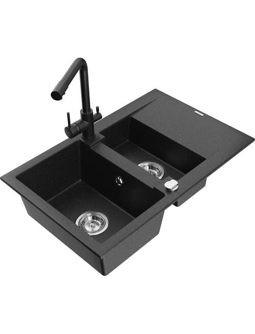 Mexen Gaspar zlewozmywak granitowy 1,5-komorowy z ociekaczem i baterią kuchenną Duero, czarny/srebrny - 6507-73-671600-70