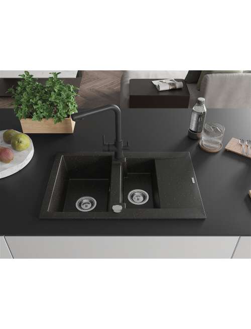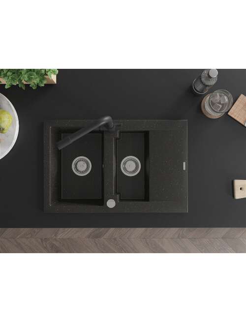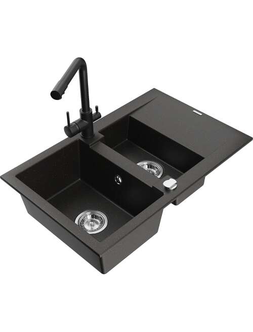 Mexen Gaspar zlewozmywak granitowy 1,5-komorowy z ociekaczem i baterią kuchenną Duero, czarny/złoty - 6507-75-671600-70