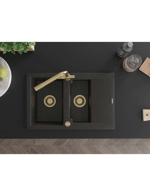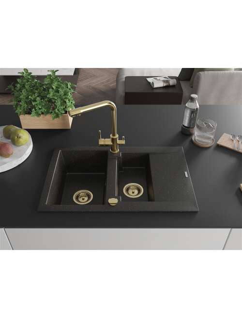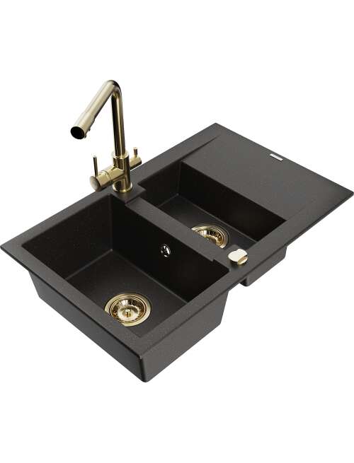 Dane techniczne: Zlewozmywak: Rozmiar: 737x475x177 mm Głębokość komory: 167 mm (większa), 107 mm (mniejsza) Wymiary komory: 395x272 mm (większa), (mniejsza) 375x182 mm Średnica odpływu: ø90 mm Typ: 1,5-komorowy z krótkim ociekaczem Rodzaj: Wpuszczany w blat Kolor: Czarny/Złoty metalik Wykończenie syfonu: Złoty Materiał: Granit (80% kruszywo granitowe 20% żywice) Otwór przelewowy: Tak Otwory: ( bateria, automat ) 2 Montaż: Uniwersalny, możliwość montażu z ociekaczem po lewej lub prawej stronie Wysoka odporność na zarysowania i przebarwienia Odporność na szok termiczny Powierzchnia ułatwiająca czyszczenie Bateria kuchenna: Materiał: Mosiądz Kolor: Złoty Głowica: Ceramiczna Perlator: Tak Typ: Dwuuchwytowa Zasięg wylewki: 235 mm Wysokość baterii: 315 mm Bateria dwugłowicowa z dodatkowym filtrem do wody pitnej |