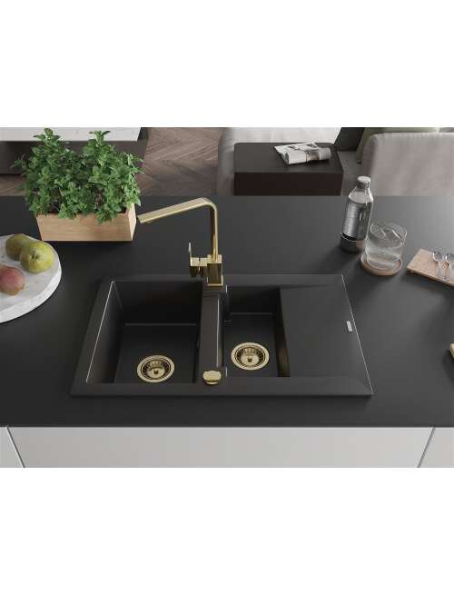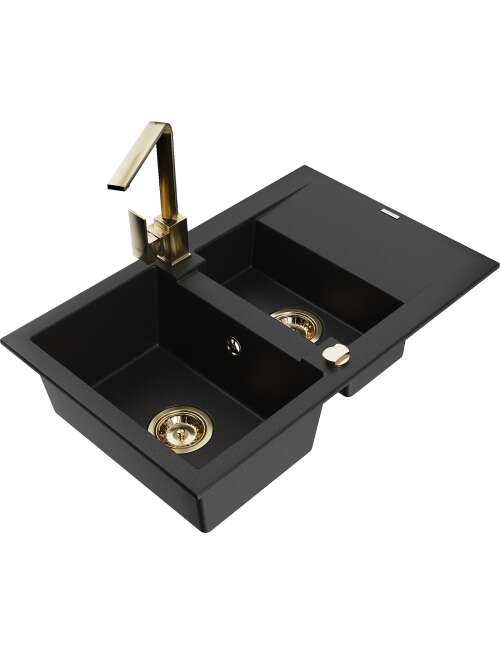 Mexen Gaspar zlewozmywak granitowy 1,5-komorowy z ociekaczem i baterią kuchenną Rita, czarny - 6507-77-670300-50
