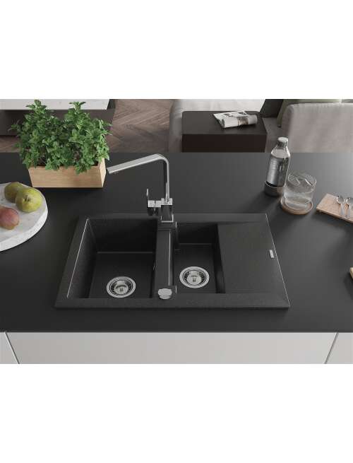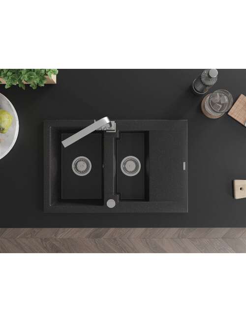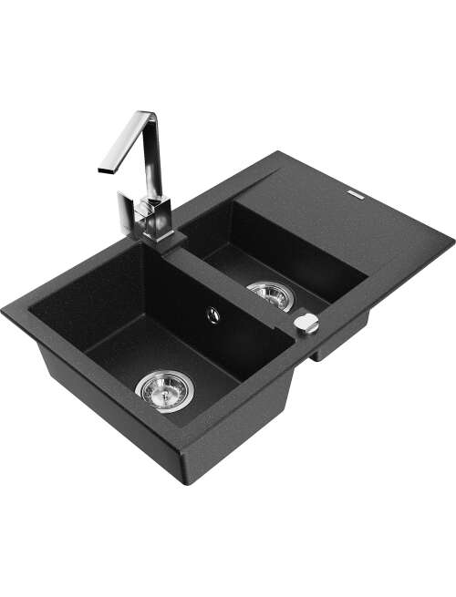 Mexen Gaspar zlewozmywak granitowy 1,5-komorowy z ociekaczem i baterią kuchenną Rita, czarny/srebrny metalik - 6507-73-670300-00