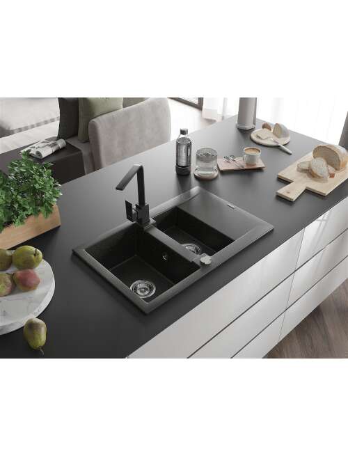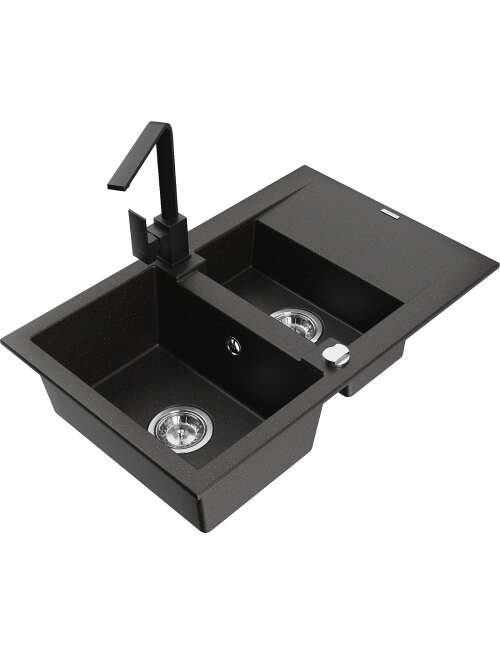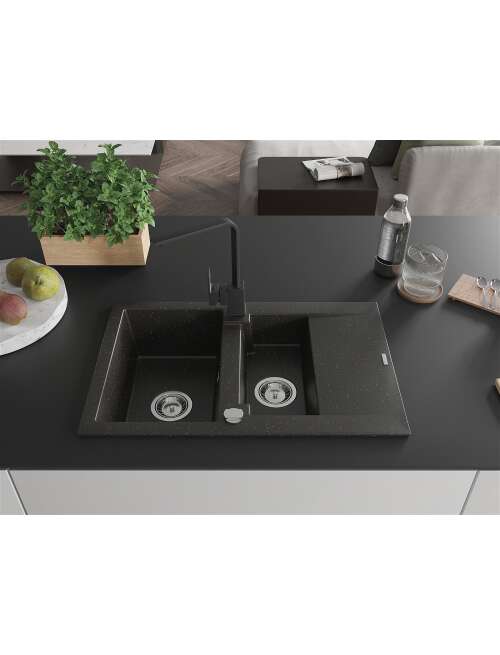 Dane techniczne: Zlewozmywak: Rozmiar: 737x475x177 mm Głębokość komory: 167 mm (większa), 107 mm (mniejsza) Wymiary komory: 395x272 mm (większa), (mniejsza) 375x182 mm Średnica odpływu: ø90 mm Typ: 1,5-komorowy z krótkim ociekaczem Rodzaj: Wpuszczany w blat Kolor: Czarny/Złoty metalik Wykończenie syfonu: Chrom Materiał: Granit (80% kruszywo granitowe 20% żywice) Otwór przelewowy: Tak Otwory: ( bateria, automat ) 2 Montaż: Uniwersalny, możliwość montażu z ociekaczem po lewej lub prawej stronie Wysoka odporność na zarysowania i przebarwienia Odporność na szok termiczny Powierzchnia ułatwiająca czyszczenie Bateria kuchenna: Materiał: Mosiądz Kolor: Czarny Głowica: Ceramiczna Perlator: Tak Typ: Jednouchwytowa Wysokość baterii: 290 mm Zasięg wylewki: 220 mm |
