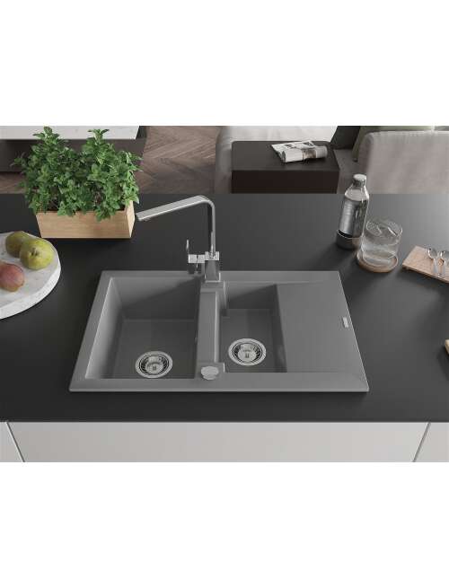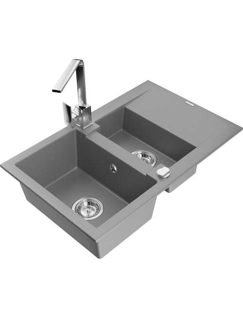 Dane techniczne: Zlewozmywak: Rozmiar: 737x475x177 mm Głębokość komory: 167 mm (większa), 107 mm (mniejsza) Wymiary komory: 395x272 mm (większa), (mniejsza) 375x182 mm Średnica odpływu: ø90 mm Typ: 1,5-komorowy z krótkim ociekaczem Rodzaj: Wpuszczany w blat Kolor: Szary Wykończenie syfonu: Chrom Materiał: Granit (80% kruszywo granitowe 20% żywice) Otwór przelewowy: Tak Otwory: ( bateria, automat ) 2 Montaż: Uniwersalny, możliwość montażu z ociekaczem po lewej lub prawej stronie Wysoka odporność na zarysowania i przebarwienia Odporność na szok termiczny Powierzchnia ułatwiająca czyszczenie Bateria kuchenna: Materiał: Mosiądz Kolor: Chrom Głowica: Ceramiczna Perlator: Tak Typ: Jednouchwytowa Wysokość baterii: 290 mm Zasięg wylewki: 220 mm |