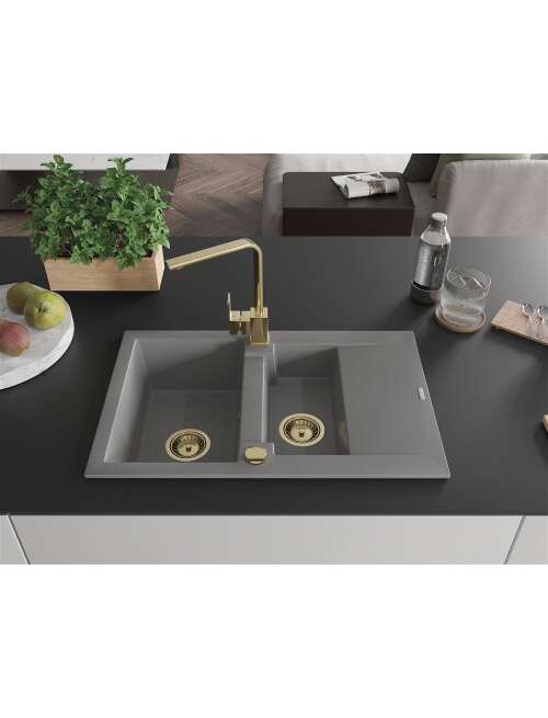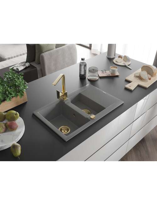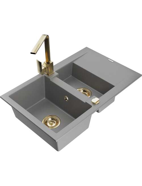 Dane techniczne: Zlewozmywak: Rozmiar: 737x475x177 mm Głębokość komory: 167 mm (większa), 107 mm (mniejsza) Wymiary komory: 395x272 mm (większa), (mniejsza) 375x182 mm Średnica odpływu: ø90 mm Typ: 1,5-komorowy z krótkim ociekaczem Rodzaj: Wpuszczany w blat Kolor: Szary Wykończenie syfonu: Złoty Materiał: Granit (80% kruszywo granitowe 20% żywice) Otwór przelewowy: Tak Otwory: ( bateria, automat ) 2 Montaż: Uniwersalny, możliwość montażu z ociekaczem po lewej lub prawej stronie Wysoka odporność na zarysowania i przebarwienia Odporność na szok termiczny Powierzchnia ułatwiająca czyszczenie Bateria kuchenna: Materiał: Mosiądz Kolor: Złoty Głowica: Ceramiczna Perlator: Tak Typ: Jednouchwytowa Wysokość baterii: 290 mm Zasięg wylewki: 220 mm |