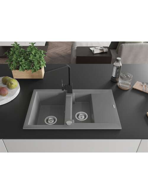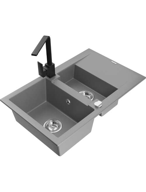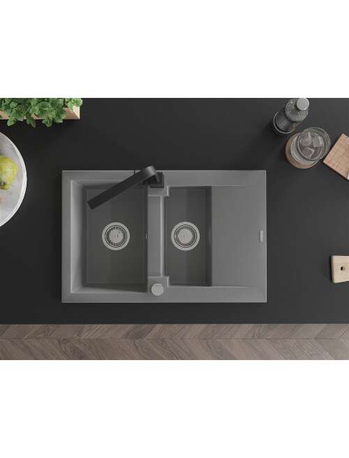 Dane techniczne: Zlewozmywak: Rozmiar: 737x475x177 mm Głębokość komory: 167 mm (większa), 107 mm (mniejsza) Wymiary komory: 395x272 mm (większa), (mniejsza) 375x182 mm Średnica odpływu: ø90 mm Typ: 1,5-komorowy z krótkim ociekaczem Rodzaj: Wpuszczany w blat Kolor: Szary Wykończenie syfonu: Chrom Materiał: Granit (80% kruszywo granitowe 20% żywice) Otwór przelewowy: Tak Otwory: ( bateria, automat ) 2 Montaż: Uniwersalny, możliwość montażu z ociekaczem po lewej lub prawej stronie Wysoka odporność na zarysowania i przebarwienia Odporność na szok termiczny Powierzchnia ułatwiająca czyszczenie Bateria kuchenna: Materiał: Mosiądz Kolor: Czarny Głowica: Ceramiczna Perlator: Tak Typ: Jednouchwytowa Wysokość baterii: 290 mm Zasięg wylewki: 220 mm |