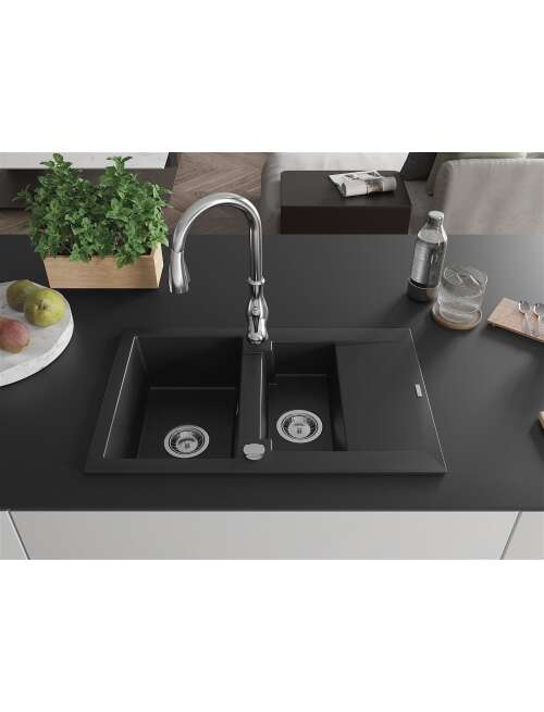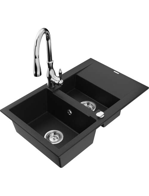 Mexen Gaspar zlewozmywak granitowy 1,5-komorowy z ociekaczem i baterią kuchenną Savita, czarny - 6507-77-672601-00