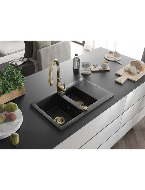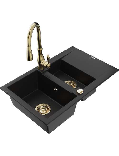 Mexen Gaspar zlewozmywak granitowy 1,5-komorowy z ociekaczem i baterią kuchenną Savita, czarny - 6507-77-672601-50