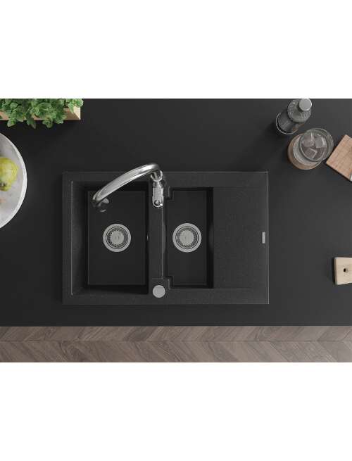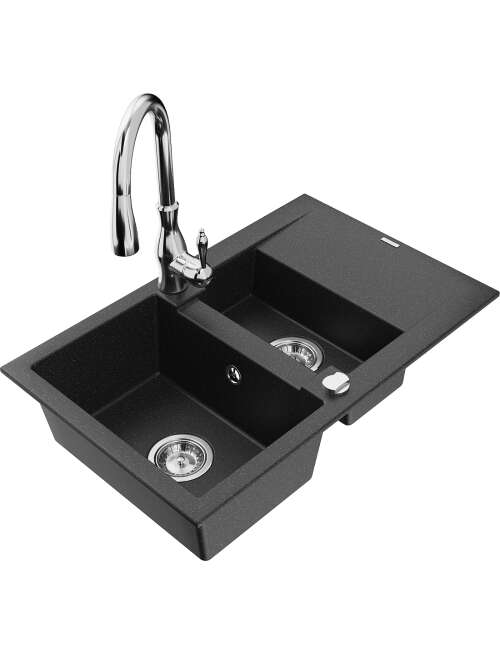 Dane techniczne: Zlewozmywak: Rozmiar: 737x475x177 mm Głębokość komory: 167 mm (większa), 107 mm (mniejsza) Wymiary komory: 395x272 mm (większa), (mniejsza) 375x182 mm Średnica odpływu: ø90 mm Typ: 1,5-komorowy z krótkim ociekaczem Rodzaj: Wpuszczany w blat Kolor: Czarny/Srebrny metalik Wykończenie syfonu: Chrom Materiał: Granit (80% kruszywo granitowe 20% żywice) Otwór przelewowy: Tak Otwory: ( bateria, automat ) 2 Montaż: Uniwersalny, możliwość montażu z ociekaczem po lewej lub prawej stronie Wysoka odporność na zarysowania i przebarwienia Odporność na szok termiczny Powierzchnia ułatwiająca czyszczenie Bateria kuchenna: Materiał: Mosiądz Kolor: Chrom Głowica: Ceramiczna Perlator: Tak Typ: Jednouchwytowa Wysokość baterii: 410 mm Zasięg wylewki: 231 mm |