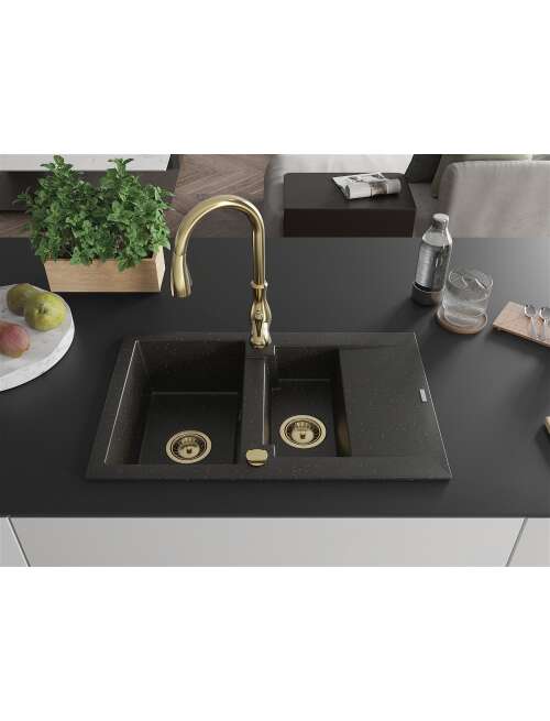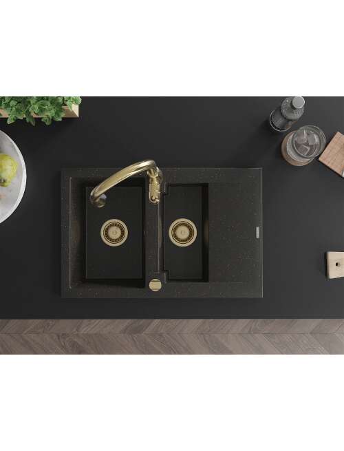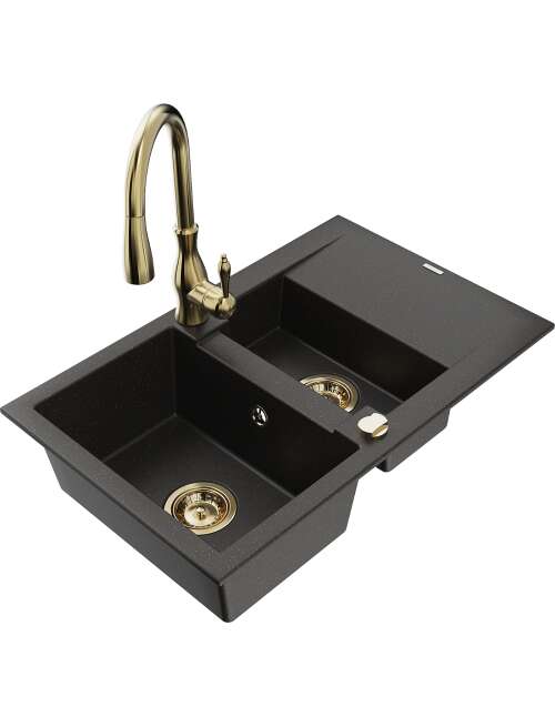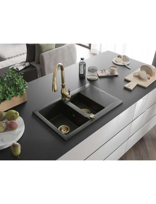 Dane techniczne: Zlewozmywak: Rozmiar: 737x475x177 mm Głębokość komory: 167 mm (większa), 107 mm (mniejsza) Wymiary komory: 395x272 mm (większa), (mniejsza) 375x182 mm Średnica odpływu: ø90 mm Typ: 1,5-komorowy z krótkim ociekaczem Rodzaj: Wpuszczany w blat Kolor: Czarny/Złoty metalik Wykończenie syfonu: Złoty Materiał: Granit (80% kruszywo granitowe 20% żywice) Otwór przelewowy: Tak Otwory: ( bateria, automat ) 2 Montaż: Uniwersalny, możliwość montażu z ociekaczem po lewej lub prawej stronie Wysoka odporność na zarysowania i przebarwienia Odporność na szok termiczny Powierzchnia ułatwiająca czyszczenie Bateria kuchenna: Materiał: Mosiądz Kolor: Złoty Głowica: Ceramiczna Perlator: Tak Typ: Jednouchwytowa Wysokość baterii: 410 mm Zasięg wylewki: 231 mm |