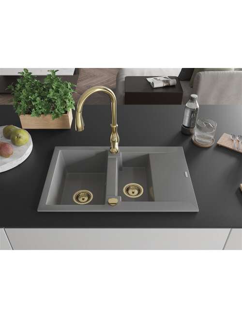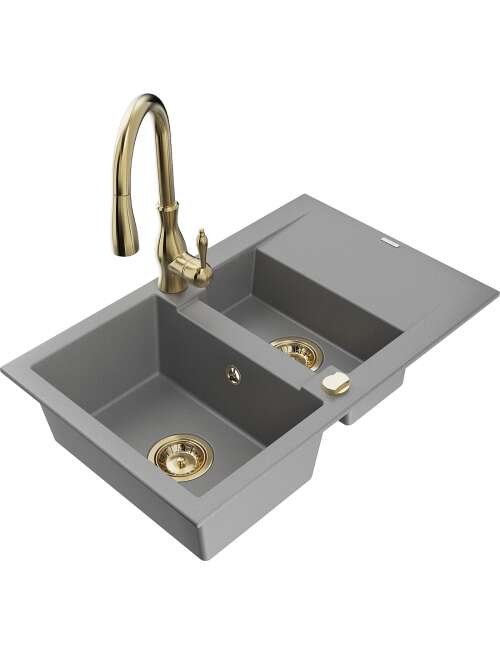 Dane techniczne: Zlewozmywak: Rozmiar: 737x475x177 mm Głębokość komory: 167 mm (większa), 107 mm (mniejsza) Wymiary komory: 395x272 mm (większa), (mniejsza) 375x182 mm Średnica odpływu: ø90 mm Typ: 1,5-komorowy z krótkim ociekaczem Rodzaj: Wpuszczany w blat Kolor: Szary Wykończenie syfonu: Złoty Materiał: Granit (80% kruszywo granitowe 20% żywice) Otwór przelewowy: Tak Otwory: ( bateria, automat ) 2 Montaż: Uniwersalny, możliwość montażu z ociekaczem po lewej lub prawej stronie Wysoka odporność na zarysowania i przebarwienia Odporność na szok termiczny Powierzchnia ułatwiająca czyszczenie Bateria kuchenna: Materiał: Mosiądz Kolor: Złoty Głowica: Ceramiczna Perlator: Tak Typ: Jednouchwytowa Wysokość baterii: 410 mm Zasięg wylewki: 231 mm |