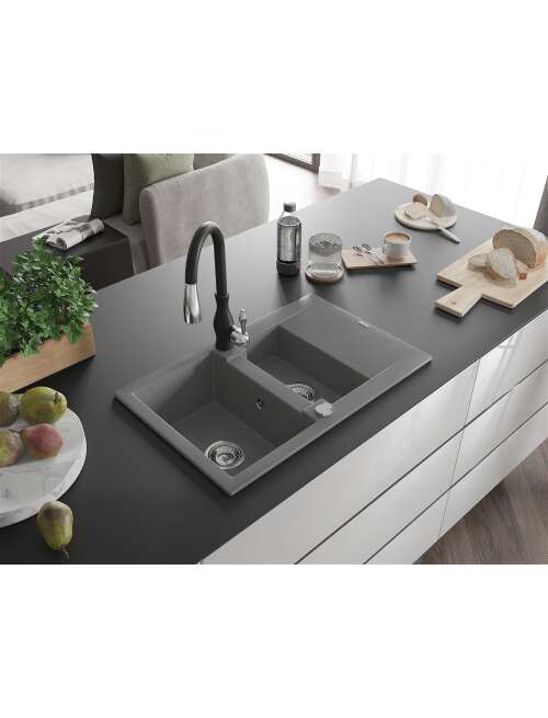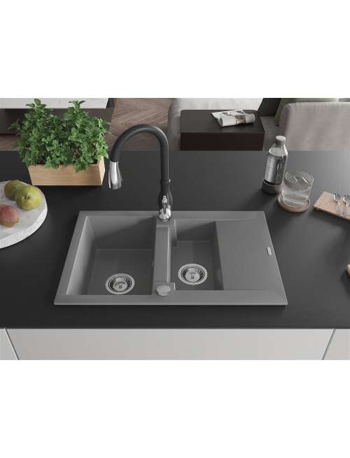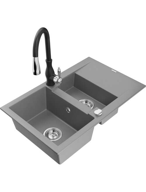 Mexen Gaspar zlewozmywak granitowy 1,5-komorowy z ociekaczem i baterią kuchenną Savita, szary - 6507-71-672601-70