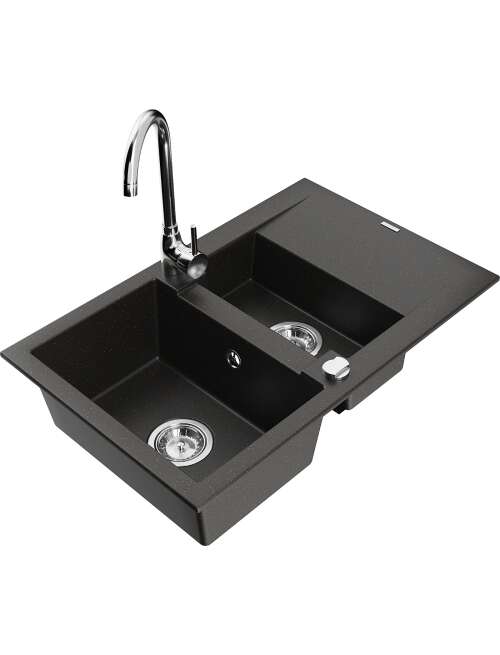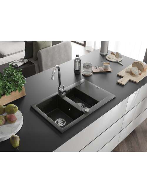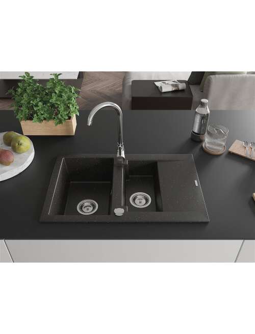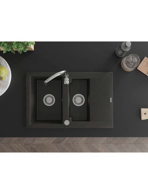 Dane techniczne: Zlewozmywak: Rozmiar: 737x475x177 mm Głębokość komory: 167 mm (większa), 107 mm (mniejsza) Wymiary komory: 395x272 mm (większa), (mniejsza) 375x182 mm Średnica odpływu: ø90 mm Typ: 1,5-komorowy z krótkim ociekaczem Rodzaj: Wpuszczany w blat Kolor: Czarny/Złoty metalik Wykończenie syfonu: Chrom Materiał: Granit (80% kruszywo granitowe 20% żywice) Otwór przelewowy: Tak Otwory: ( bateria, automat ) 2 Montaż: Uniwersalny, możliwość montażu z ociekaczem po lewej lub prawej stronie Wysoka odporność na zarysowania i przebarwienia Odporność na szok termiczny Powierzchnia ułatwiająca czyszczenie Bateria kuchenna: Materiał: Mosiądz Kolor: Chrom Głowica: Ceramiczna Perlator: Tak Typ: Jednouchwytowa Wysokość baterii: 335 mm Zasięg wylewki: 180 mm |