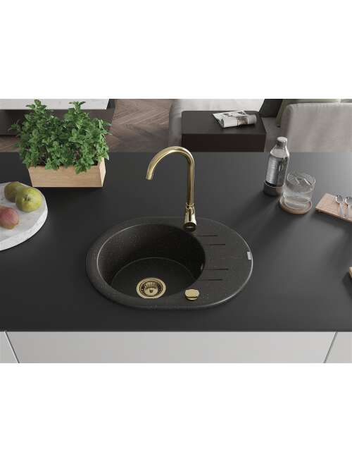 Dane techniczne: Rozmiar: 586x458x190 mm Głębokość komory: 180 mm Szerokość komory: 378x374 mm Średnica odpływu: ø90 mm Rodzaj: 1-komorowy z krótkim ociekaczem Typ: Wpuszczany w blat Materiał: Granit Kolor: Czarny/Złoty metalik Wykończenie syfonu: Złoty Otwór przelewowy: Tak Otwór na baterie: Tak Syfon automatyczny w komplecie Wysoka odporność na zarysowania i przebarwienia Odporność na szok termiczny Powierzchnia ułatwiająca czyszczenie Dwa dodatkowe podfrezowane otwory do samodzielnego wybicia ø35 |