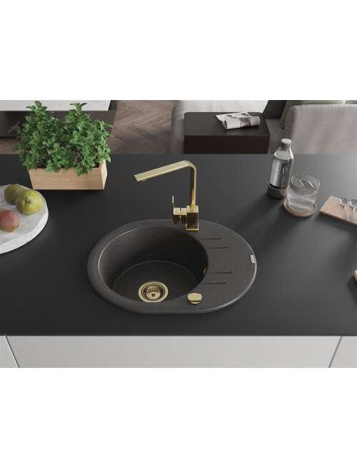 Dane techniczne: Zlewozmywak: Rozmiar: 586x458x190 mm Głębokość komory: 180 mm Szerokość komory: 378x374 mm Średnica odpływu: ø90 mm Typ: 1-komorowy z krótkim ociekaczem Rodzaj: Wpuszczany w blat Kolor: Czarny nakrapiany Wykończenie syfonu: Złoty Materiał: Granit (80% kruszywo granitowe 20% żywice) Otwór przelewowy: Tak Otwory: ( bateria, automat ) 2 Montaż: Uniwersalny, możliwość montażu z ociekaczem po lewej lub prawej stronie Wysoka odporność na zarysowania i przebarwienia Odporność na szok termiczny Powierzchnia ułatwiająca czyszczenie Dwa dodatkowe podfrezowane otwory do samodzielnego wybicia ø35 Bateria kuchenna: Materiał: Mosiądz Kolor: Złoty Głowica: Ceramiczna Perlator: Tak Typ: Jednouchwytowa Wysokość baterii: 290 mm Zasięg wylewki: 220 mm |