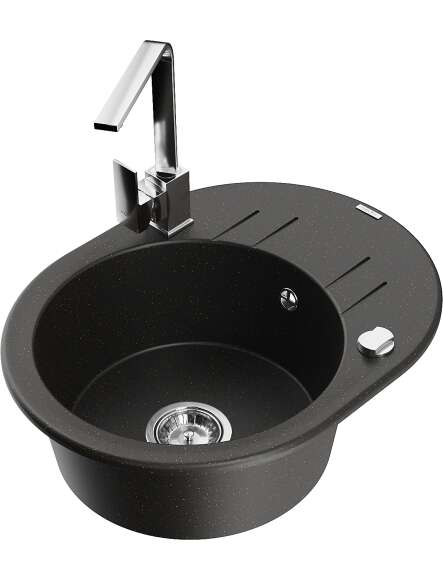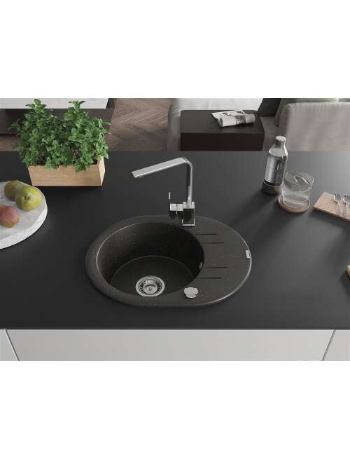 Mexen Kevin zlewozmywak granitowy 1-komorowy z ociekaczem i baterią kuchenną Rita, czarny/złoty metalik - 6517-75-670300-00
