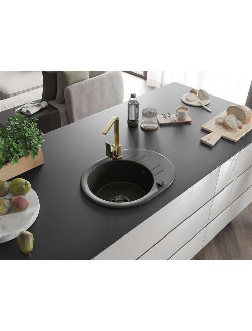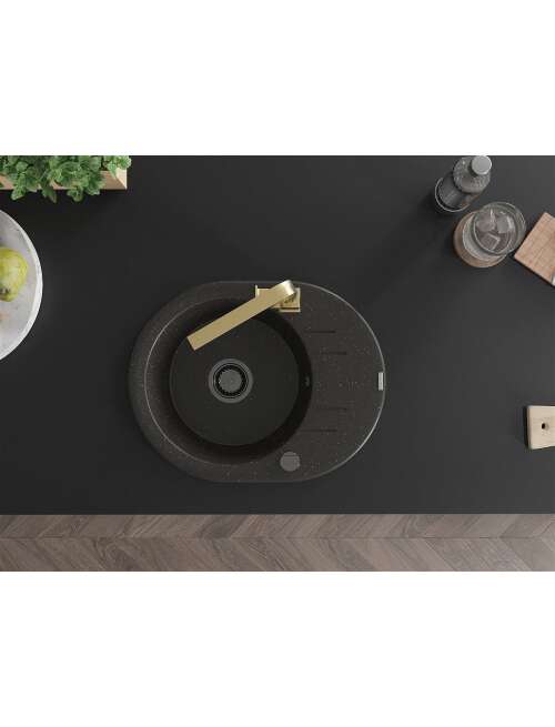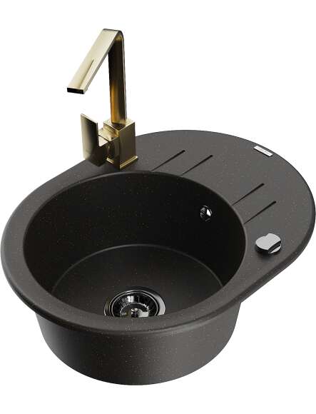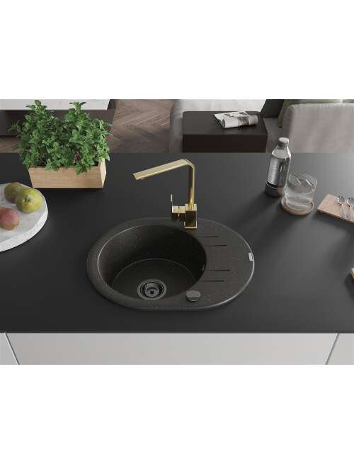 Mexen Kevin zlewozmywak granitowy 1-komorowy z ociekaczem i baterią kuchenną Rita, czarny/złoty metalik - 6517-75-670300-50-B