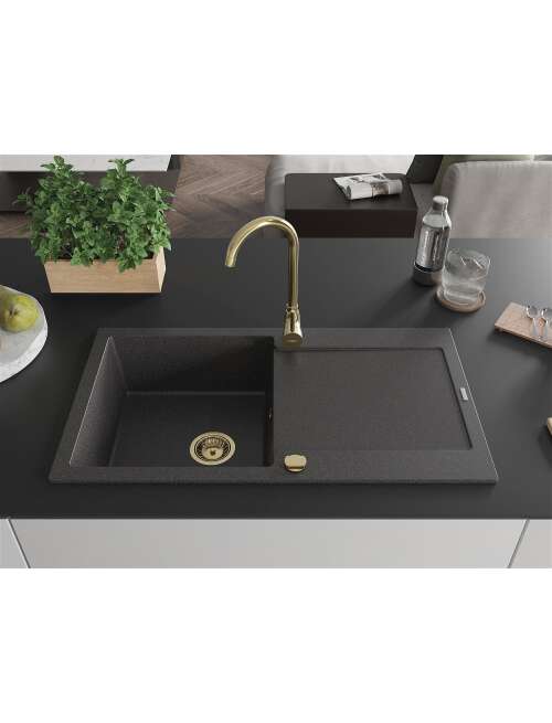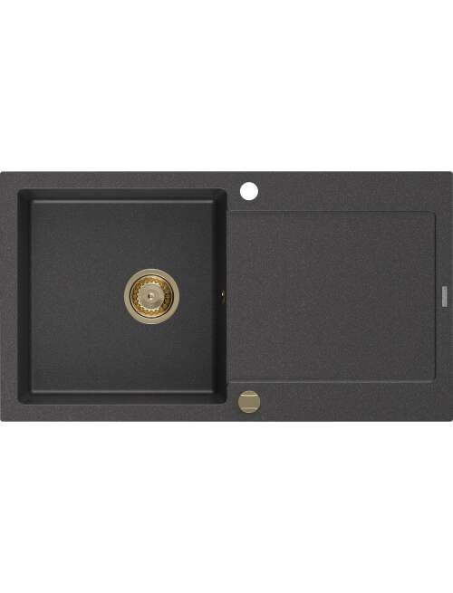 Dane techniczne: Rozmiar: 900x500x190 mm Głębokość komory: 180 mm Wymiary komory: 430x415 mm Średnica odpływu: ø90 mm Rodzaj: 1-komorowy z ociekaczem Typ: Wpuszczany w blat Materiał: Granit Kolor: Czarny nakrapiany Wykończenie syfonu: Złoty Otwór przelewowy: Tak Otwór na baterie: Tak Syfon automatyczny w komplecie Wysoka odporność na zarysowania i przebarwienia Odporność na szok termiczny Powierzchnia ułatwiająca czyszczenie Dwa dodatkowe podfrezowane otwory do samodzielnego wybicia ø35 |